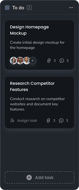 - At the bottom of any column (e.g., "To Do," "In Progress"), click the + Add Task button.