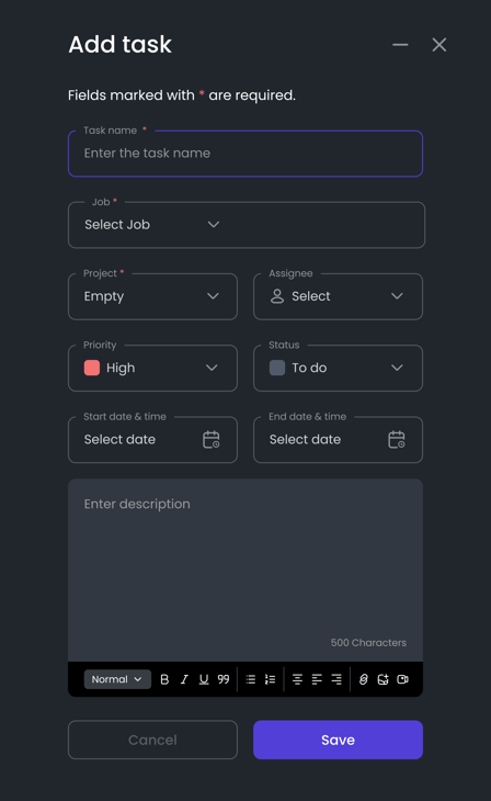 - Priority: Set the task priority (e.g., High, Medium, Low).
