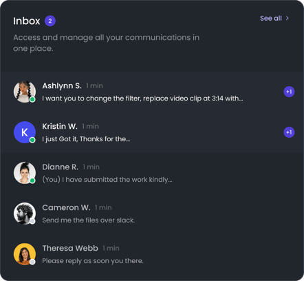 The Inbox shows your most recent conversations with clients and collaborators. Each chat entry includes: