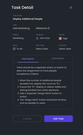 - Click on the task card to open the Task Detail panel on the right-hand side of the screen. [Placeholder for Snapshot: Include a screenshot of the Task Detail panel, highlighting sections such as Task Name, Assignee, Priority, and Comments.]