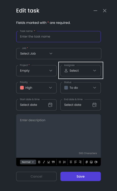 - Assignee: Change the assigned team member by selecting from the dropdown.