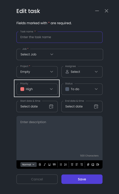 - Priority: Adjust the task’s priority level (High, Medium, Low).